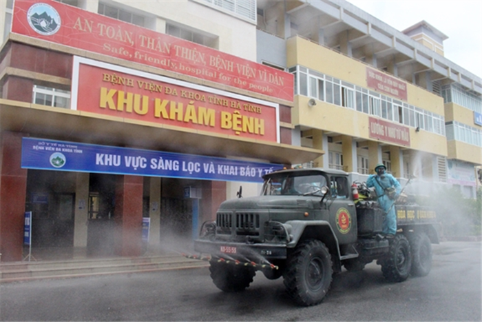 Bộ đội Tiểu đoàn Hóa học 38 phun hóa chất khử khuẩn Bệnh viện Đa khoa Hà Tĩnh. |