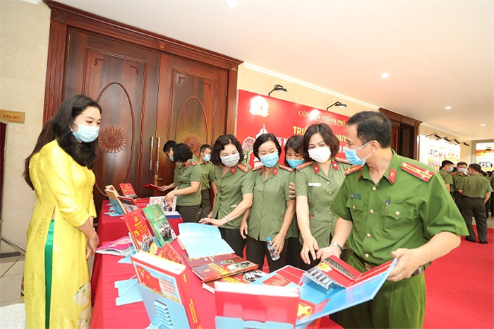 Trung tướng Nguyễn Hải Trung, Giám đốc Công an thành phố Hà Nội với các đại biểu tham quan triển lãm. |
