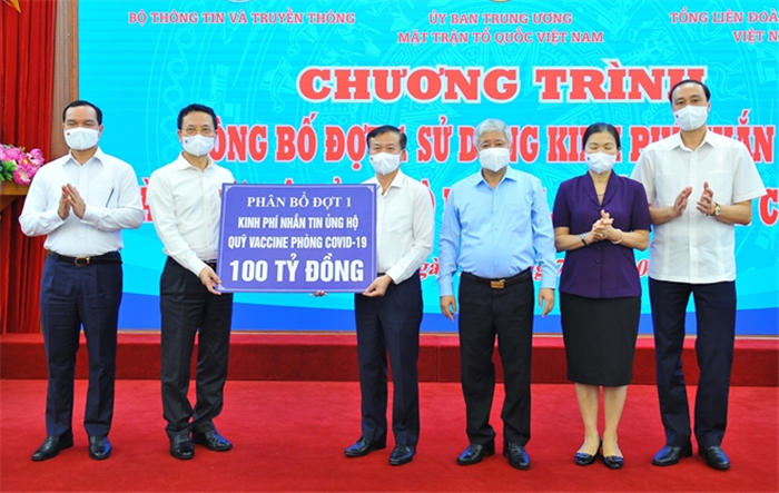 Chiều 13/7, Ủy ban Trung ương MTTQ Việt Nam phối hợp với Bộ Thông tin và Truyền thông (TT&TT), Tổng liên đoàn Lao động Việt Nam tổ chức chương trình trao số tiền phân bổ đợt 1 là 100 tỷ đồng tới Quỹ vaccine phòng COVID-19.