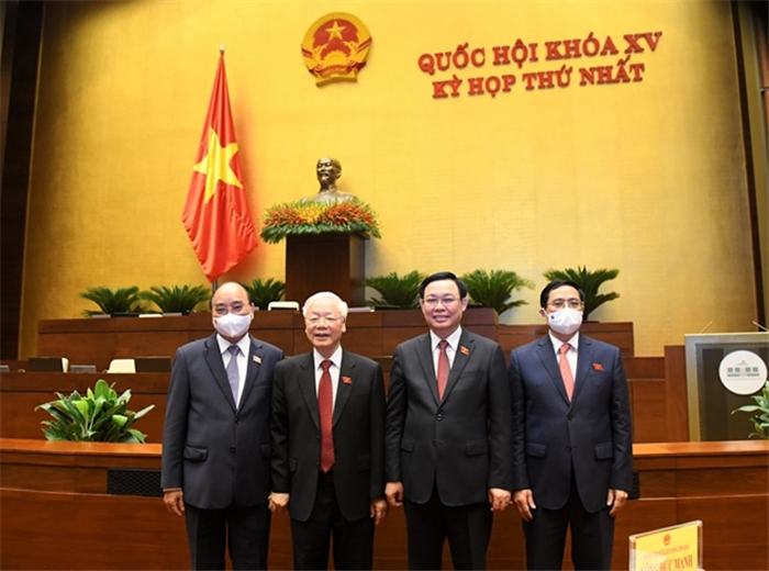 Tổng Bí thư Nguyễn Phú Trọng, Chủ tịch nước Nguyễn Xuân Phúc, Chủ tịch Quốc hội Vương Đình Huệ, Thủ tướng Chính phủ Phạm Minh Chính tại phiên khai mạc