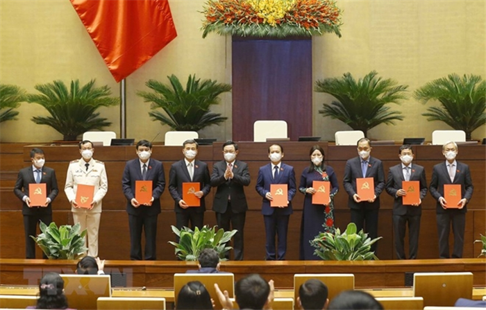 Chủ tịch Quốc hội Vương Đình Huệ trao Quyết định Tổ trưởng Tổ đảng Đoàn đại biểu Quốc hội; Nghị quyết phê chuẩn kết quả bầu Trưởng Đoàn đại biểu Quốc hội các tỉnh, thành phố. Ảnh TTXVN. |