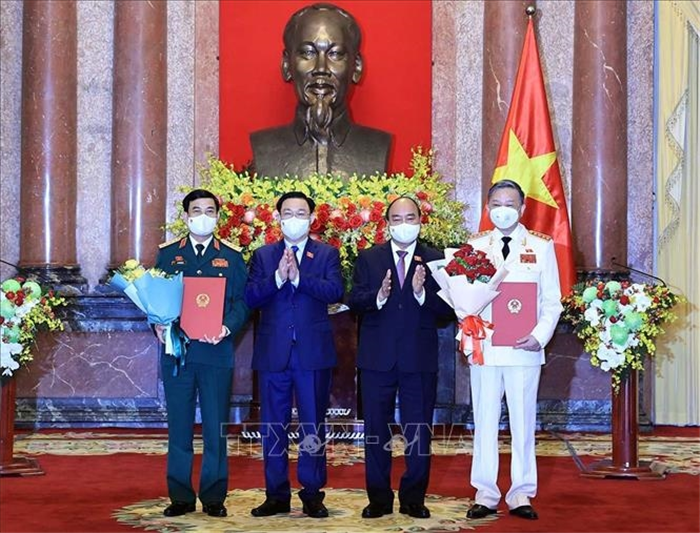 Chủ tịch nước Nguyễn Xuân Phúc trao Quyết định, Chủ tịch Quốc hội Vương Đình Huệ tặng hoa Bộ trưởng Bộ Quốc phòng, Đại tướng Phan Văn Giang và Bộ trưởng Bộ Công an, Đại tướng Tô Lâm. Ảnh: TTXVN