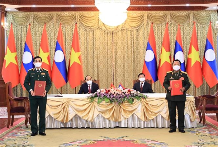 Chủ tịch nước Nguyễn Xuân Phúc và Tổng Bí thư, Chủ tịch nước Lào Thongloun Sisoulith chứng kiến Lễ ký Biên bản hợp tác giữa hai Bộ Quốc phòng về xây dựng công trình Trường Văn hoá dân tộc nội trú tại Lào; Ý định thư giữa hai Bộ Quốc phòng về hợp tác tìm kiếm, cứu nạn do Bộ trưởng Bộ Quốc phòng Phan Văn Giang và Phó thủ tướng, Bộ trưởng Quốc phòng Lào Chansamone Chanyalath thực hiện. Ảnh: TTXVN