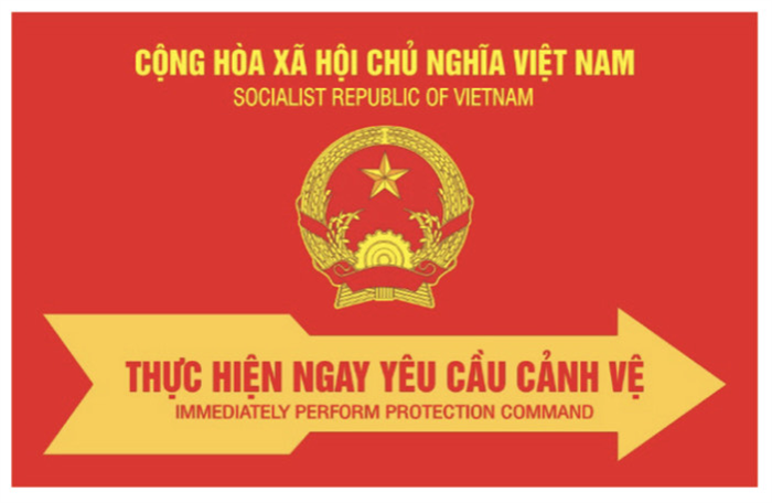 Mặt trước, từ trên xuống dưới: CỘNG HÒA XÃ HỘI CHỦ NGHĨA VIỆT NAM; SOCIALIST REPUBLIC OF VIETNAM; hình Quốc huy nước Cộng hòa xã hội chủ nghĩa Việt Nam, đường kính 21 mm; THỰC HIỆN NGAY YÊU CẦU CẢNH VỆ; IMMEDIATELY PERFORM PROTECTION COMMAND.