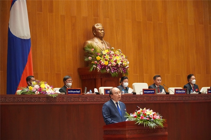 Từ diễn đàn trọng thể này, thay mặt lãnh đạo Đảng, Nhà nước và nhân dân Việt Nam, một lần nữa tôi nhiệt liệt chúc mừng những thành tựu to lớn của các đồng chí và tin tưởng vững chắc rằng Đảng, Nhà nước và nhân dân Lào sẽ tiếp tục kiểm soát thành công dịch bệnh Covid-19 và giành được nhiều thành tựu mới to lớn hơn nữa trong công cuộc đổi mới, thực hiện thắng lợi Nghị quyết Đại hội XI Đảng Nhân dân Cách mạng Lào và Kế hoạch phát triển kinh tế - xã hội 5 năm lần thứ IX, xây dựng thành công đất nước Lào hòa bình, độc lập, dân chủ, thống nhất và phồn vinh, vững bước tiến lên chủ nghĩa xã hội.