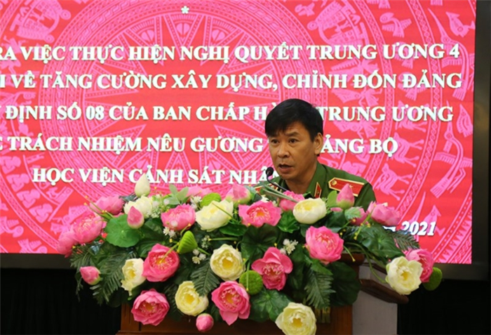 Theo báo cáo, Đảng bộ Học viện Cảnh sát nhân dân là một trong 08 Đảng bộ cấp trên trực tiếp của tổ chức cơ sở đảng trực thuộc Đảng ủy Công an Trung ương. Nhận thức sâu sắc ý nghĩa to lớn của việc triển khai thực hiện Nghị quyết Trung ương 4 khóa XII và các quy định về trách nhiệm nêu gương, trên cơ sở những kết quả tích cực đã đạt được, trong giai đoạn 2019 - 2021, Đảng ủy Học viện Cảnh sát nhân dân tiếp tục quan tâm và nghiêm túc trong lãnh đạo, chỉ đạo việc quán triệt, triển khai thực hiện Nghị quyết và các quy định về trách nhiệm nêu gương trong Đảng bộ Học viện.