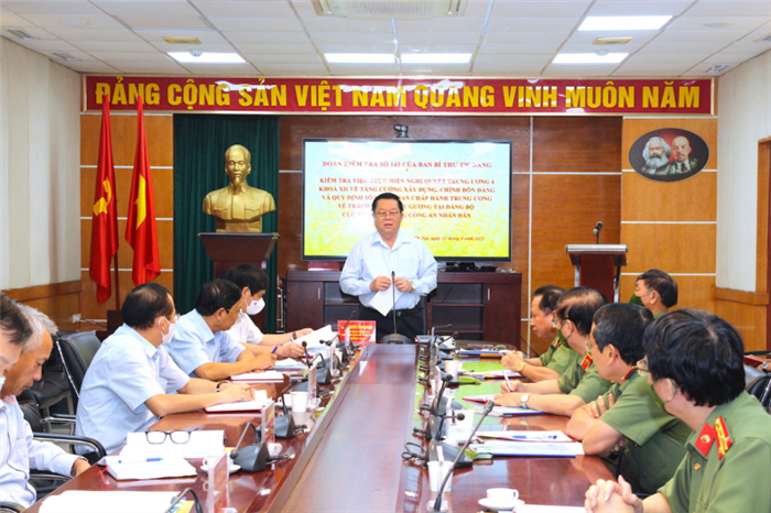 Sáng nay, 12/8, Đoàn kiểm tra số 143 của Ban Bí thư do đồng chí Nguyễn Trọng Nghĩa, Bí thư Trung ương Đảng, Trưởng Ban Tuyên giáo Trung ương làm Trưởng đoàn đã đến làm việc với Ban Thường vụ Đảng ủy Cục Truyền thông CAND về việc thực hiện Nghị quyết Trung ương 4 (khóa XII) và Quy định số 08 của Ban Chấp hành Trung ương về trách nhiệm nêu gương.