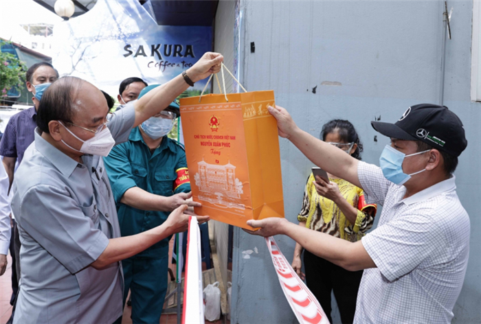 Chủ tịch nước Nguyễn Xuân Phúc tặng quà người dân nơi thực hiện giãn cách xã hội.