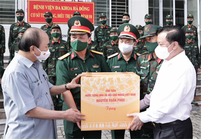 Chủ tịch nước động viên các cán bộ, chiến sĩ tại khu điều trị bệnh nhân F0, quận Hoàng Mai, Hà Nội.