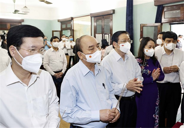 Chủ tịch nước Nguyễn Xuân Phúc và các thành viên trong đoàn thành kính dâng hoa, dâng hương tại Nhà 67.