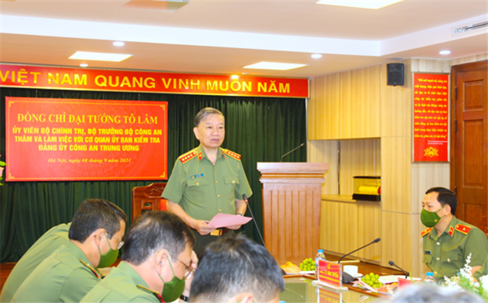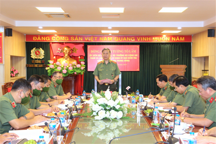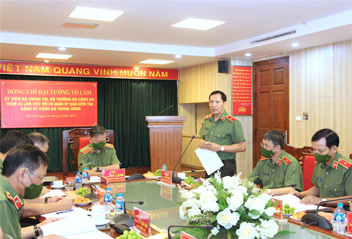 Phát biểu tại buổi làm việc, Bộ trưởng Tô Lâm khẳng định: Đảng ủy Công an Trung ương đang tập trung chỉ đạo xây dựng Đề án "Xây dựng lực lượng CAND đến năm 2030 cách mạng, chính quy, tinh nhuệ, hiện đại", trong đó xây dựng đội ngũ cán bộ Kiểm tra Đảng các cấp trong CAND đủ sức đáp ứng yêu cầu, nhiệm vụ thời gian tới là yêu cầu cấp bách hiện nay. Buổi làm việc của đồng chí Bộ trưởng, lãnh đạo các đơn vị chức năng thuộc Bộ với Cơ quan UBKT Đảng ủy Công an Trung ương nhằm đánh giá kết quả thực hiện nhiệm vụ công tác chuyên môn và bàn các nhiệm vụ, giải pháp cụ thể để xây dựng UBKT, Cơ quan UBKT các cấp trong CAND đáp ứng yêu cầu, nhiệm vụ trong thời gian tới.
