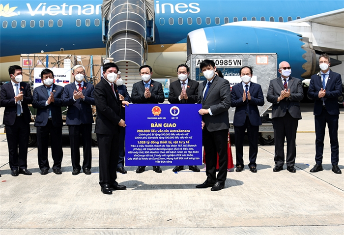 200.000 liều vắc xin, cùng các trang thiết bị và vật tư y tế, nhất là các bộ kit xét nghiệm COVID-19, tổng trị giá trên 1.028 tỉ đồng được ủng hộ trong chuyến công tác châu Âu của Đoàn đại biểu cấp cao Quốc hội Việt Nam được bàn giao ngay khi về tới sân bay Nội Bài.