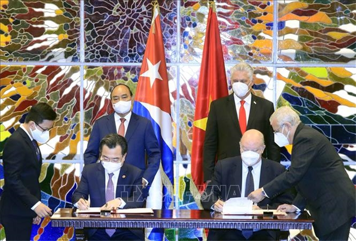 Chủ tịch nước Nguyễn Xuân Phúc và Bí thư thứ nhất Ban Chấp hành Trung ương Đảng Cộng sản Cuba, Chủ tịch nước Cộng hòa Cuba Miguel Díaz-Canel Bermúdez chứng kiến lễ ký các văn kiện hợp tác giữa hai nước. Ảnh: TTXVN |