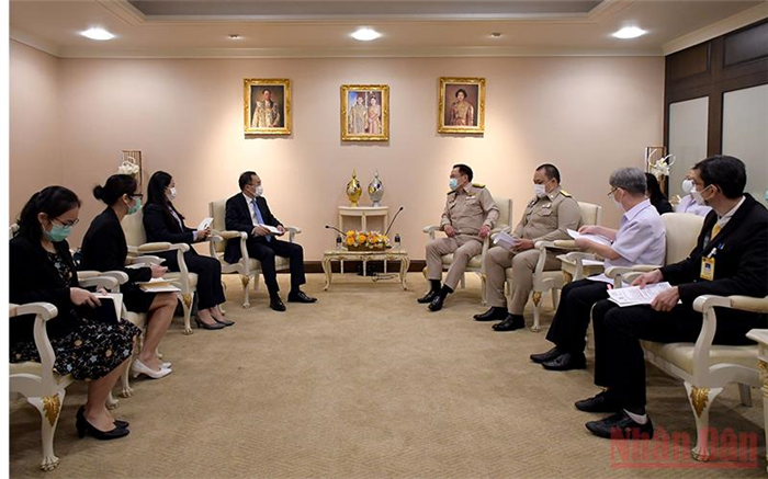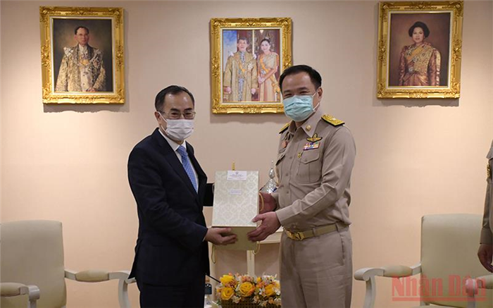 Đại sứ cảm ơn Chính phủ Hoàng gia Thái Lan đã luôn ủng hộ Việt Nam trong cuộc chiến chống đại dịch Covid-19, hỗ trợ cán bộ ngoại giao, cộng đồng người Việt Nam tại Thái Lan sớm được tiêm vaccine phòng Covid-19, cũng như tạo điều kiện thuận lợi về thủ tục gia hạn thị thực cho công dân Việt Nam bị kẹt tại Thái Lan do dịch.