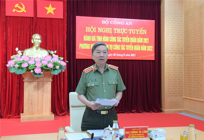 Chiều 30/9/2021, tại Hà Nội, Đại tướng Tô Lâm, Ủy viên Bộ Chính trị, Bộ trưởng Bộ Công an chủ trì Hội nghị trực tuyến với Công an các đơn vị địa phương để đánh giá công tác tuyển quân năm 2021, phương hướng, nhiệm vụ công tác tuyển quân năm 2022.