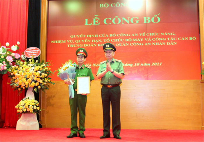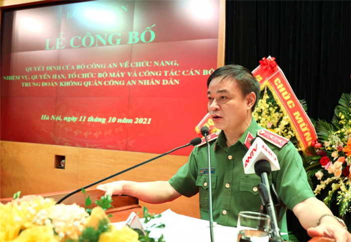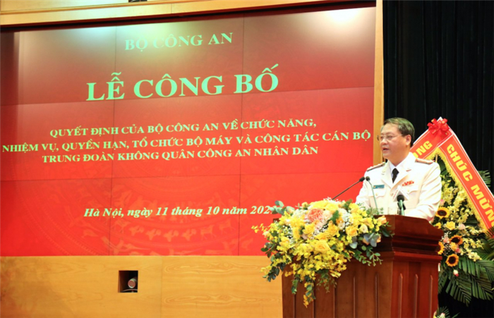 Thay mặt Đảng ủy Công an Trung ương, lãnh đạo Bộ Công an, Bộ trưởng Tô Lâm chúc mừng Bộ Tư lệnh CSCĐ được nhận Quyết định thành lập thêm một đơn vị mới để tăng cường sức chiến đấu, chúc mừng Trung đoàn Không quân CAND luôn hoàn thành xuất sắc nhiệm vụ chính trị được giao; đồng thời chúc mừng các đồng chí được lãnh đạo Bộ Công an, lãnh đạo Bộ Tư lệnh CSCĐ tin tưởng bố trí giữ các vị trí nòng cốt thuộc Trung đoàn.