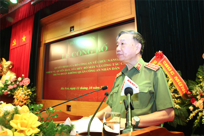 "Là đơn vị mới thành lập, đặc biệt là đơn vị hoàn toàn mới trong lực lượng CAND là trách nhiệm hết sức nặng nề, nhưng cũng là niềm vinh dự mà Ban Thường vụ Đảng ủy Công an Trung ương và lãnh đạo Bộ Công an giao cho. Tôi tin tưởng rằng, với truyền thống của đơn vị Anh hùng lực lượng vũ trang, các đồng chí sẽ từng bước xây dựng Trung đoàn Không quân CAND trưởng thành, phát triển, vững mạnh, bảo đảm sẵn sàng chiến đấu cao, cơ động nhanh, đủ sức hoàn thành mọi nhiệm vụ, góp phần xây dựng lực lượng CAND nói chung, lực lượng CSCĐ nói riêng cách mạng, chính quy, tinh nhuệ, hiện đại", Bộ trưởng Tô Lâm nhấn mạnh.