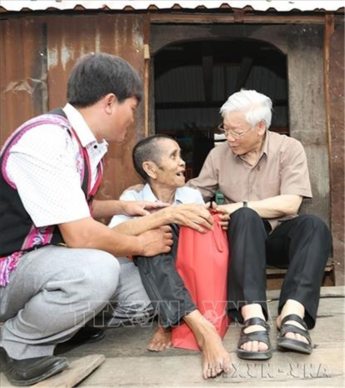 Tổng Bí thư Nguyễn Phú Trọng thăm, tặng quà gia đình thương binh Đinh Phi, là hộ gia đình chính sách có hoàn cảnh đặc biệt khó khăn ở làng Tung Ke 2, xã Ayun, huyện Chư Sê, tỉnh Gia Lai (12/4/2017). |