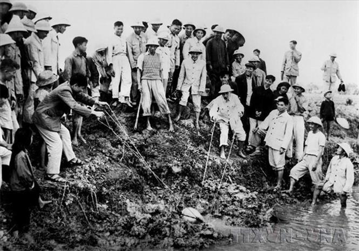 Chủ tịch Hồ Chí Minh đến thăm và tham gia tát nước chống hạn cùng nông dân xã Đại Thanh, Hà Đông (nay là Hà Nội), ngày 12/1/1958. |