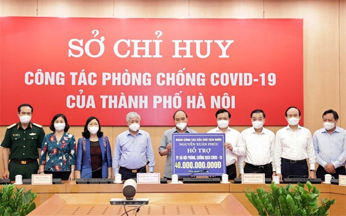 Chủ tịch Nước Nguyễn Xuân Phúc và đoàn công tác trao số tiền hỗ trợ công tácphòng, chống dịch COVID-19 cho thành phố Hà Nội. |