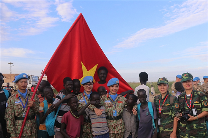 Sĩ quan gìn giữ hòa bình Việt Nam cùng các em nhỏ tại Bentiu, Nam Sudan. Ảnh: CGGHBVN. |