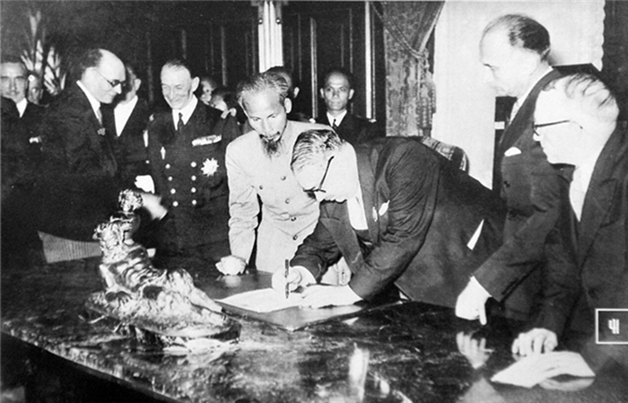 Chủ tịch Hồ Chí Minh và Bộ trưởng Hải ngoại Pháp Marius Moutet ký bản tạm ước ngày 14-9-1946. Ảnh tư liệu. |