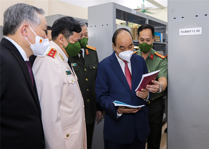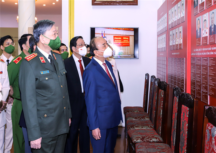 Đồng chí Nguyễn Xuân Phúc - Ủy viên Bộ Chính trị, Chủ tịch nước cùng các đại biểu thăm Phòng truyền thống Học viện ANND.