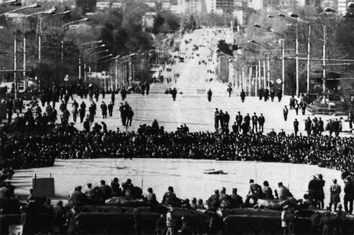 Lực lượng ly khai đối mặt với hàng rào binh sĩ của Bộ Nội vụ phía trước trụ sở Đảng Cộng sản Tajikistan ở thủ đô Dushanbe vào ngày 15-1-1990. Giới chức Xô viết phải ban bố tình trạng khẩn cấp trong thành phố này. Ảnh: RIA. |