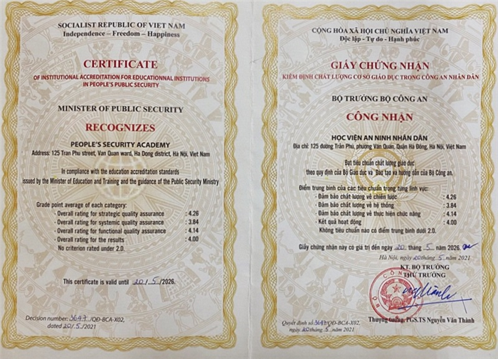 Học viện An ninh nhân dân chính thức được cấp giấy chứng nhận kiểm định chất lượng cơ sở giáo dục