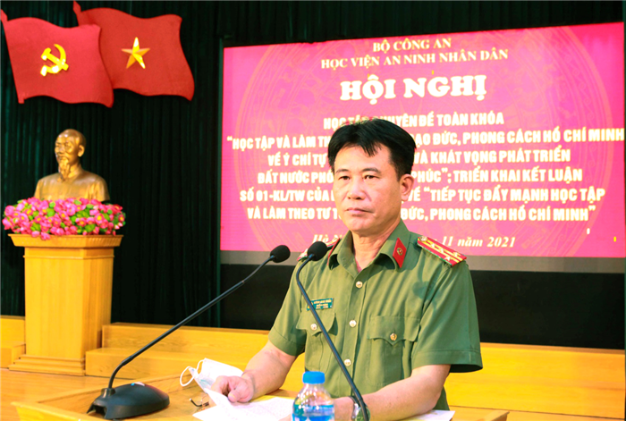 Triển khai Kết luận số 01-LK/TW của Bộ Chính trị về “tiếp tục đẩy mạnh học tập và làm theo tư tưởng, đạo đức, phong cách Hồ Chí Minh”, chiều ngày 03/11/2021, tại Hà Nội, Học viện An ninh nhân dân (ANND) đã tổ chức Hội nghị học tập chuyên đề toàn khóa “Học tập và làm theo tư tưởng, đạo đức, phong cách Hồ Chí Minh về ý chí tự lực, tự cường và khát vọng phát triển đất nước phồn vinh, hạnh phúc”.