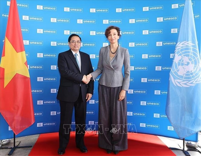 Sáng 5/11 theo giờ địa phương, Thủ tướng Chính phủ Phạm Minh Chính đã tới thăm trụ sở Tổ chức Giáo dục, Khoa học và Văn hóa của Liên hợp quốc (UNESCO) tại thủ đô Paris của Pháp và hội kiến bà Audrey Azoulay, Tổng Giám đốc UNESCO.
