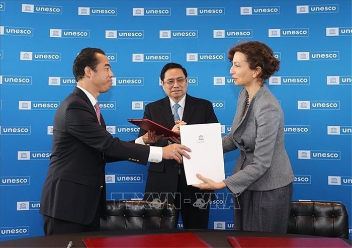 Thủ tướng Phạm Minh Chính chứng kiến Lễ ký kết giữa Bộ Ngoại giao Việt Nam và UNESCO. Ảnh: TTXVN. |