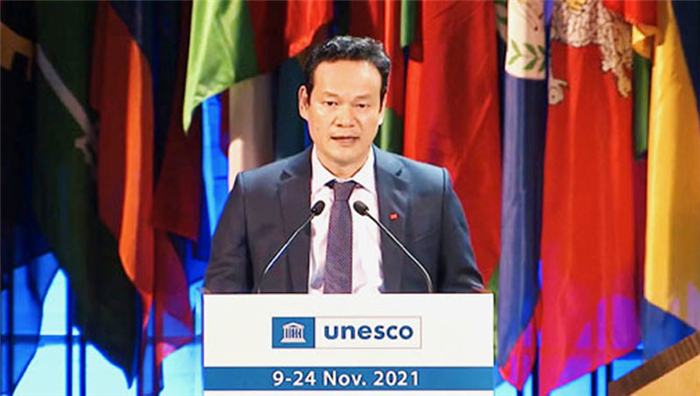 Tổng Thư ký Ủy ban Quốc gia UNESCO Việt Nam phát biểu tại Kỳ họp Đại Hội đồng UNESCO lần thứ 41.