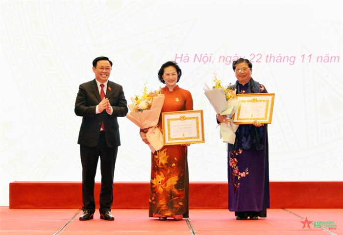 Tại buổi lễ, Chủ tịch Quốc hội Vương Đình Huệ trao Huy hiệu 40 năm tuổi Đảng và tặng hoa chúc mừng nguyên Chủ tịch Quốc hội Nguyễn Thị Kim Ngân và nguyên Phó chủ tịch Thường trực Quốc hội Tòng Thị Phóng.