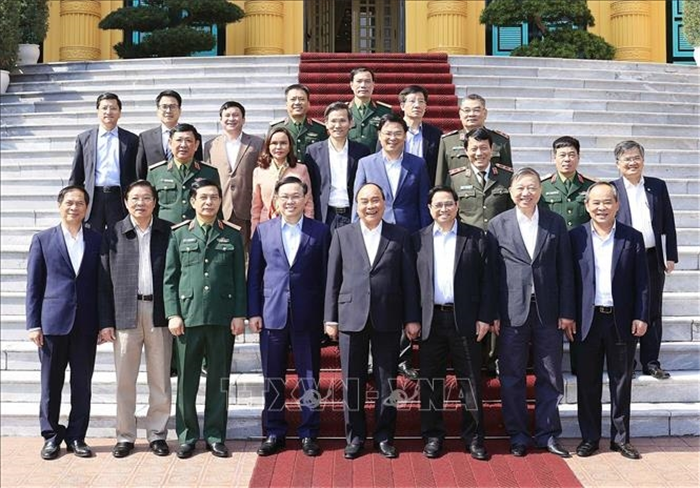 Đồng chí Nguyễn Xuân Phúc, Ủy viên Bộ Chính trị, Chủ tịch nước, Chủ tịch Hội đồng Quốc phòng và An ninh; đồng chí Phạm Minh Chính, Ủy viên Bộ Chính trị, Thủ tướng Chính phủ, Phó chủ tịch Hội đồng Quốc phòng và An ninh; đồng chí Vương Đình Huệ, Ủy viên Bộ Chính trị, Chủ tịch Quốc hội, Ủy viên Chủ tịch Hội đồng Quốc phòng và An ninh và các đại biểu. |