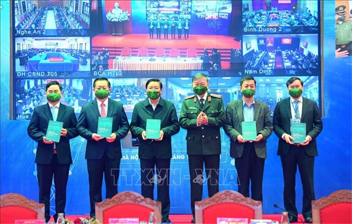 Đại tướng, GS,TS Tô Lâm, Ủy viên Bộ Chính trị, Bộ trưởng Bộ Công an tặng sách "Chủ quyền không gian mạng - Yêu cầu thời đại và nghĩa vụ quốc gia" cho các đại biểu tham dự hội thảo. |