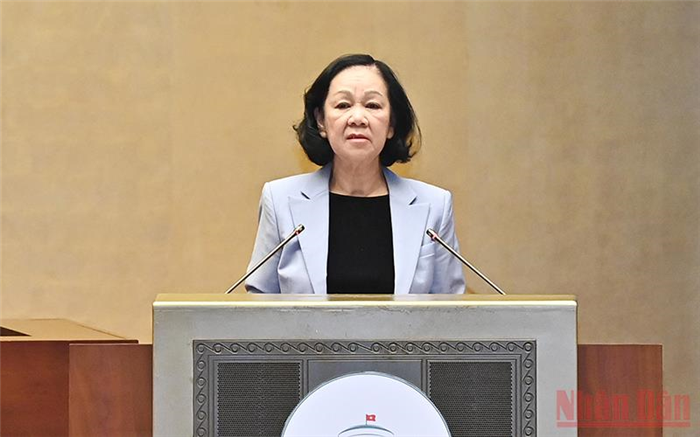 Đồng chí Trương Thị Mai, Ủy viên Bộ Chính trị, Bí thư Trung ương Đảng, Trưởng Ban Tổ chức Trung ương phát biểu tại Hội nghị.