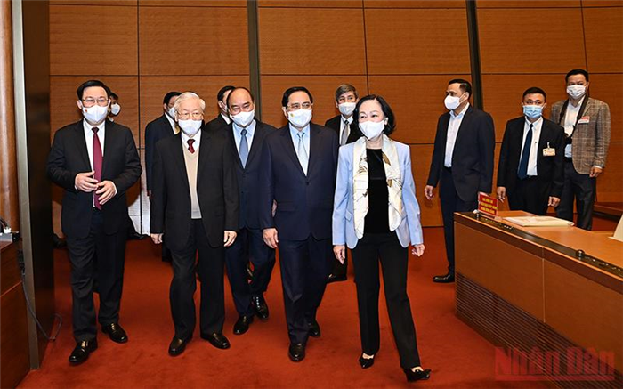 Tổng Bí thư Nguyễn Phú Trọng, Chủ tịch nước Nguyễn Xuân Phúc, Thủ tướng Phạm Minh Chính, Chủ tịch Quốc hội Vương Đình Huệ và các đồng chí lãnh đạo Đảng, Nhà nước dự Hội nghị tại điểm cầu Trung ương.