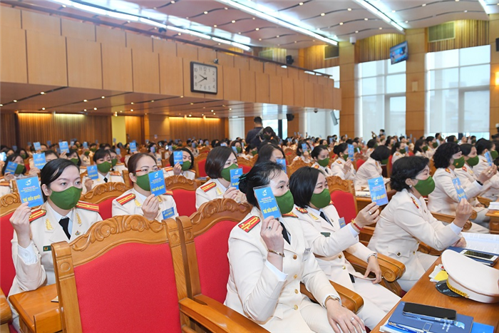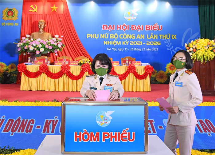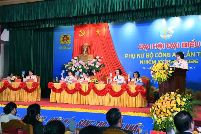 Các đại biểu biểu quyết tại Đại hội. Tổ chức Hội Phụ nữ trong Công an nhân dân ngày càng phát triển, đội ngũ cán bộ Hội được trẻ hóa, ngày càng trưởng thành và khẳng định được vai trò của phụ nữ Công an nhân dân trong công tác lãnh đạo và quản lý các cấp. Trình độ lý luận chính trị, pháp luật, nghiệp vụ, nhất là số chị em có trình độ tiến sỹ tăng nhanh, đã có 10 đồng chí có học hàm Phó Giáo sư, gần 180 nữ Tiến sỹ Công an nhân dân; tỷ lệ phụ nữ tham gia lãnh đạo các cấp ngày càng tăng, qua đó đã khẳng định vững chắc vị thế vai trò của phụ nữ trong lĩnh vực công tác công an.