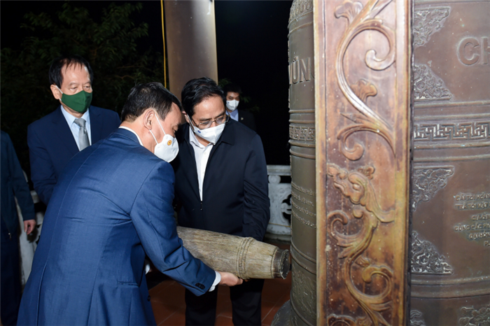 Thủ tướng Phạm Minh Chính thỉnh chuông tại nơi yên nghỉ của Đại tướng Võ Nguyên Giáp. Ảnh: VGP/Nhật Bắc