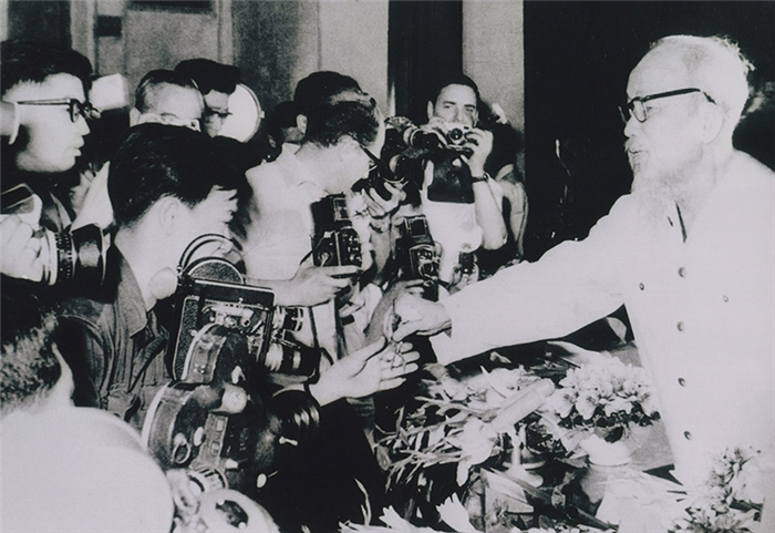 Chủ tịch Hồ Chí Minh tặng hoa nhà quay phim Phan Thế Hùng, Xưởng phim Vô tuyến Truyền hình, nhân ngày Quốc tế Lao động 1-5-1968. Ảnh: Thông tấn xã Việt Nam |