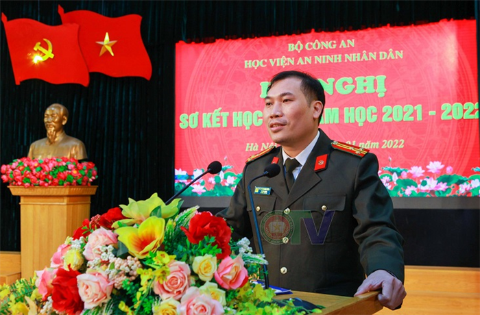 Mở đầu Hội nghị Sơ kết, được sự uỷ quyền của Giám đốc Học viện, Thượng tá, TS Chu Quang Thiện - Chánh Văn phòng Học viện đã trình bày tóm tắt Báo cáo Sơ kết công tác Học kỳ I và phương hướng công tác Học kỳ II năm học 2021 - 2022.