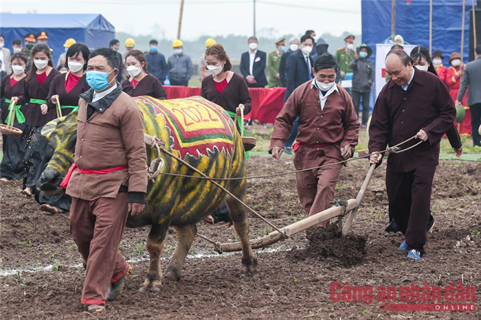 Chủ tịch nước Nguyễn Xuân Phúc thực hiện nghi lễ cày tịch điền, khai mở một mùa vụ mới với mong ước mưa thuận gió hòa, nhà nhà no đủ, đất nước phồn thịnh.