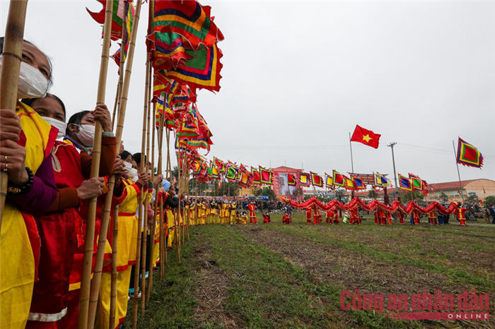 Đội cờ và múa lân của người dân xã Tiên Sơn (Hà Nam).