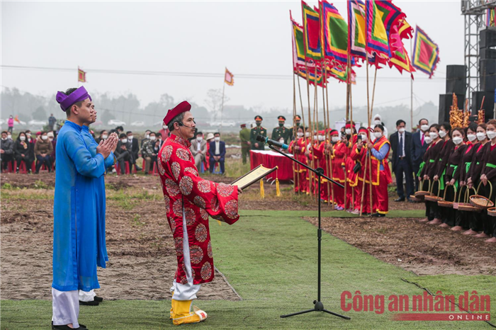 Nghệ nhân Phạm Chí Khang (nghệ nhân làng trống Đọi Tam) đọc văn trình trước đàn tế Thần Nông và linh vị vua Lê Đại Hành.