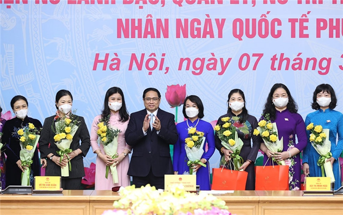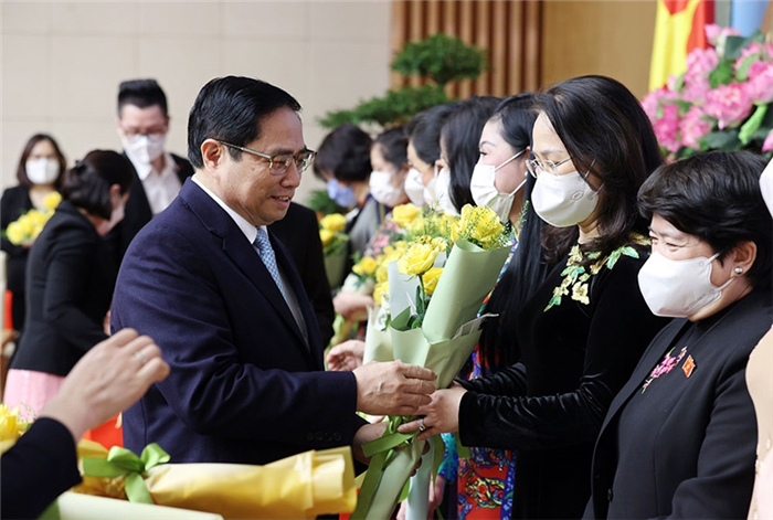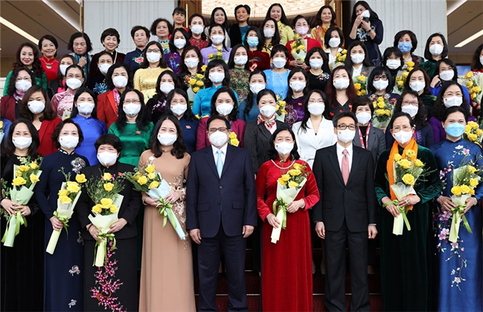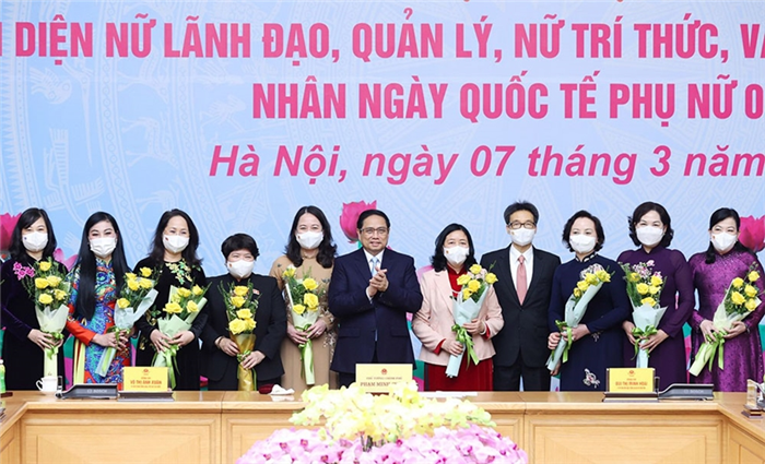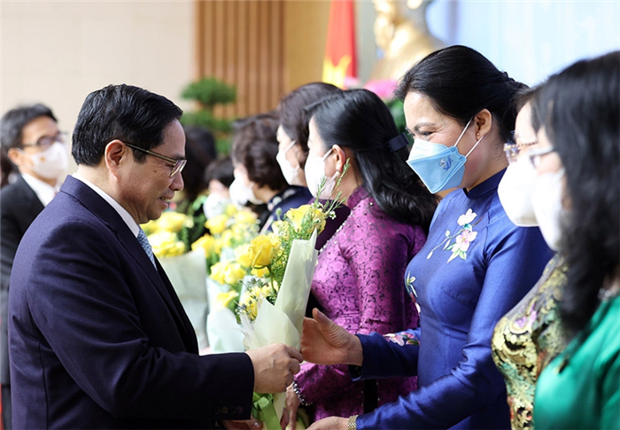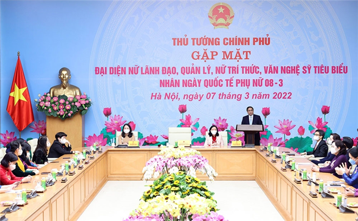 Chỉ số bất bình đẳng giới của Việt Nam xếp thứ 65/162 quốc gia và vùng lãnh thổ; xếp 87/156 về chỉ số thu hẹp khoảng cách giới. Liên hợp quốc và cộng đồng quốc tế ghi nhận, đánh giá cao những nỗ lực thực hiện bình đẳng giới và vì sự tiến bộ của phụ nữ. Có 20 tập thể và 49 nhà khoa học nữ xuất sắc trên các lĩnh vực đã được trao tặng giải thưởng Kovalevskaia trong 35 năm qua, hàng ngàn nữ trí thức có nhiều thành công trong nước và quốc tế về nghiên cứu khoa học, mang lại giá trị kinh tế cao và tính nhân văn sâu sắc. Thủ tướng Phạm Minh Chính bày tỏ băn khoăn, trăn trở bởi trong thực tế còn nhiều mảnh đời phụ nữ có hoàn cảnh khó khăn, đời sống còn nghèo nàn, còn lạc hậu, mù chữ. Vẫn còn nhiều chị em phụ nữ bị bạo hành, bị xâm hại, phân biệt đối xử…, gây ra những hậu quả nghiêm trọng đối với sức khỏe thể chất và tinh thần. Đặc biệt, không khỏi đau lòng khi dịch Covid-19 vừa qua đã để lại hàng ngàn cháu bé mồ côi, nhiều trẻ em không được đến trường học, nhiều phụ nữ khó khăn về việc làm, về nhà ở, về cuộc sống khi phải đối mặt với dịch Covid-19… Với mong muốn tập hợp, phát huy tài năng, trí tuệ, lòng nhân ái và truyền thống tốt đẹp của phụ nữ Việt Nam trong phục hồi và phát triển kinh tế - xã hội bền vững; đồng thời khắc phục dần những bất cập liên quan đến công tác nữ và bình đẳng giới, vì sự tiến bộ của phụ nữ, Thủ tướng yêu cầu các bộ, ngành liên quan tiếp tục nâng cao hơn nữa nhận thức, thực hiện chủ trương của Đảng trong Nghị quyết Đại hội XIII là “Xây dựng người phụ nữ Việt Nam thời đại mới. Nâng cao chất lượng nguồn nhân lực nữ, đáp ứng yêu cầu phát triển bền vững và hội nhập quốc tế”, góp phần đạt được các mục tiêu phát triển bền vững đến năm 2030. Thủ tướng nhấn mạnh, ngay sau buổi gặp mặt hôm nay, các bộ, ngành liên quan kiểm tra, rà soát việc thực hiện các chính sách hỗ trợ người dân, trong đó có phụ nữ và trẻ em khó khăn do ảnh hưởng của đại dịch Covid-19; đồng thời, rà soát toàn bộ chính sách đối với phụ nữ, tham mưu Chính phủ, Thủ tướng Chính phủ theo thẩm quyền về các chính sách bảo đảm cuộc sống tốt hơn cho nữ công nhân trong khu công nghiệp, nhất là chính sách về nhà ở, nhà trẻ, trường học để chị em phụ nữ yên tâm lao động sản xuất. Nghiên cứu, đề xuất chế độ, chính sách đối với nữ giáo viên, nhất là giáo viên mầm non, vùng sâu, vùng xa; chính sách đối với vận động viên nữ, các nữ văn nghệ sĩ… Người đứng đầu Chính phủ đề nghị chú trọng hơn nữa công tác quy hoạch nguồn cán bộ nữ làm công tác lãnh đạo, quản lý. Tiếp tục nâng cao chất lượng hoạt động của các cấp hội liên hiệp phụ nữ trong giai đoạn hiện nay. Động viên, tạo môi trường thích hợp, phát huy vai trò của đội ngũ nữ trí thức và văn nghệ sĩ để chị em đóng góp nhiều hơn nữa, hiệu quả hơn nữa trong công cuộc đổi mới, hội nhập và phát triển đất nước. Quan tâm hơn nữa công tác bồi dưỡng cho phụ nữ kiến thức về nuôi dạy con, tổ chức cuộc sống gia đình, giữ gìn và phát huy bản sắc văn hoá dân tộc, bảo vệ thuần phong, mĩ tục, truyền thống tốt đẹp của phụ nữ Việt Nam, nêu cao lòng nhân ái, khoan dung, đoàn kết, giúp đỡ lẫn nhau, nhất là khi gặp khó khăn, hoạn nạn; mạnh dạn lên án những hành vi bạo hành, vô đạo đức trong gia đình, xã hội. Thủ tướng Phạm Minh Chính tin tưởng rằng, truyền thống nhân hậu, đảm đang, trí tuệ và cống hiến luôn tỏa sáng trong mỗi người phụ nữ Việt Nam; phẩm chất tốt đẹp của phụ nữ sẽ mãi thắp sáng niềm tin và tình yêu thương, hạnh phúc cho mỗi thành viên trong gia đình, xã hội, cộng đồng, làm giàu thêm bản sắc văn hóa của phụ nữ Việt Nam trong thời đại mới, góp phần xây dựng đất nước Việt Nam thân yêu của chúng ta ngày càng hùng cường và thịnh vượng.