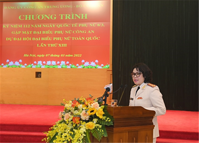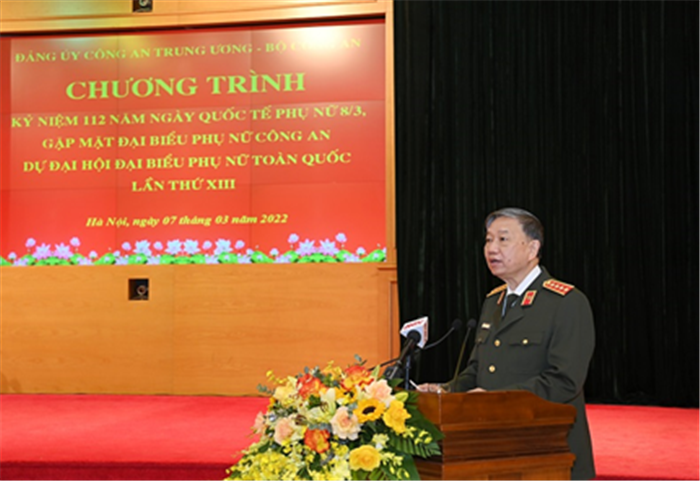Chiều 07/3/2022, tại Hà Nội, Đảng ủy Công an Trung ương, Bộ Công an tổ chức Chương trình kỷ niệm 112 năm Ngày Quốc tế Phụ nữ (8/3/1910 - 8/3/2022) và gặp mặt đại biểu phụ nữ Công an nhân dân (CAND) dự Đại hội đại biểu phụ nữ toàn quốc lần thứ XIII. Đại tướng Tô Lâm, Ủy viên Bộ Chính trị, Bí thư Đảng ủy Công an Trung ương, Bộ trưởng Bộ Công an dự và phát biểu chúc mừng.