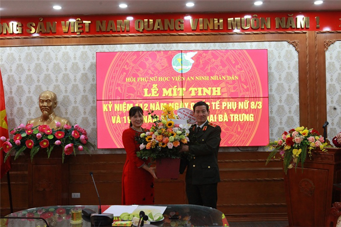 Thiếu tướng PGS.TS Lê Ngọc An - Phó Bí thư Đảng ủy, Phó Giám đốc Học viện tặng hoa chúc mừng Hội Phụ nữ Học viện.