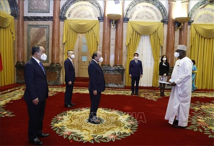 Chủ tịch nước Nguyễn Xuân Phúc nhận Quốc thư của Đại sứ Sierra Leone Ernest Mbaimba Ndomahina ngày 9-3-2022. Ảnh: TTXVN |