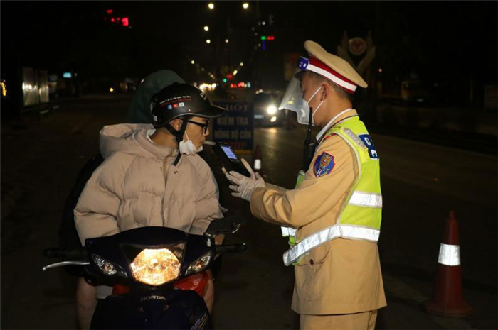 Lực lượng CSGT Công an Nghệ An kiểm tra vi phạm nồng độ cồn của người tham gia giao thông.